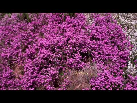 Tour Scotland video of Purple and White Scottish Heather in Perthshire, Scotland. Heather is an important food source for various sheep and deer which can graze the tips of the plants when snow covers low-growing vegetation. Willow Grouse and Red Grouse feed on the young shoots and seeds of this plant. Formerly heather was used to dye wool yellow and to tan leather. With malt, heather is an ingredient in gruit, a mixture of flavourings used in the brewing of heather-beer during the Middle Ages before the use of hops. White heather is regarded in Scotland as being lucky, a tradition brought from Balmoral to England by Queen Victoria and sprigs of it are often sold as a charm and worked into bridal bouquets. Heather stalks are used by a small industry in Scotland as a raw material for sentimental jewelry. The stalks are stripped of bark, dyed in bright colors and then compressed with resin.