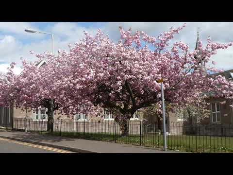 Tour Scotland 4K Spring travel video of Cherry Blossom trees in bloom by the village hall on Abbey Road on visit to Scone by Perth, Perthshire. The cherry blossoms and the leaves are edible and used in many traditional Japanese sweets and tea. They are first pickled and then used in recipes for mochi cakes, candies, and even cookies. You can also brew sakura blossom tea or make cocktails with preserved blossoms. The trees are a symbol of spring because it is a time of renewal. However, because the blooms are short lived, they are also symbolic of the fleeting nature of life.