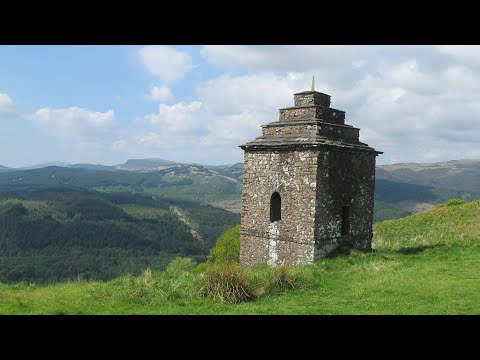 Tour Scotland 4K short travel video clip, with Scottish music, of Dun Na Cuaiche Watchtower above Loch Fyne and Inveraray, on ancestry, genealogy, family history visit and trip to Argyll and Bute, Britain, United Kingdom. The tower was built as a folly in 1756, by the owners of the land and castle. Its purpose was purely decorative, and its position was very specifically picked. Instead of being located on the highest point of the hill, it cleverly sits on the edge of the steep face of the hill and therefore when being viewed from the town or castle it is silhouetted against the sky. Despite having been struck by lightning on multiple occasions, it continues to stand strong after all these years. Of interest to folks with ancestry, genealogy or Scottish Family Roots in Scotland who may wish to visit one day. Find things to see and do in Scotland where you are always welcome